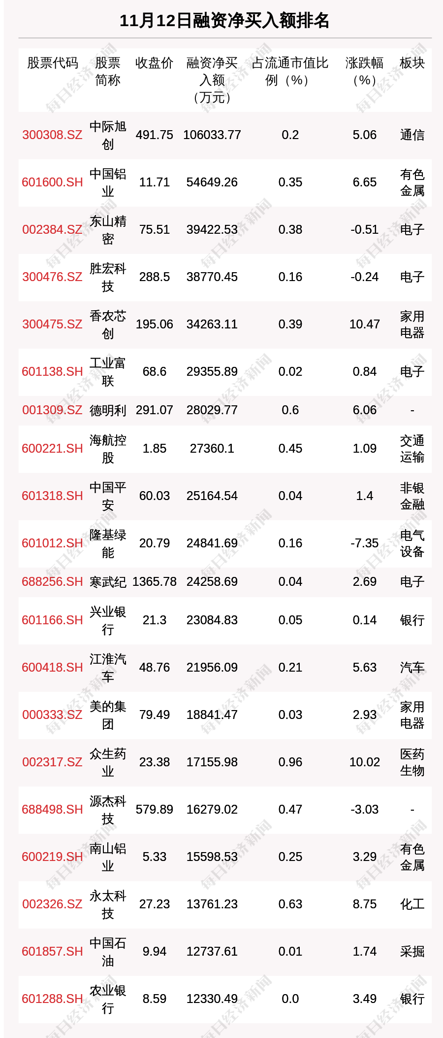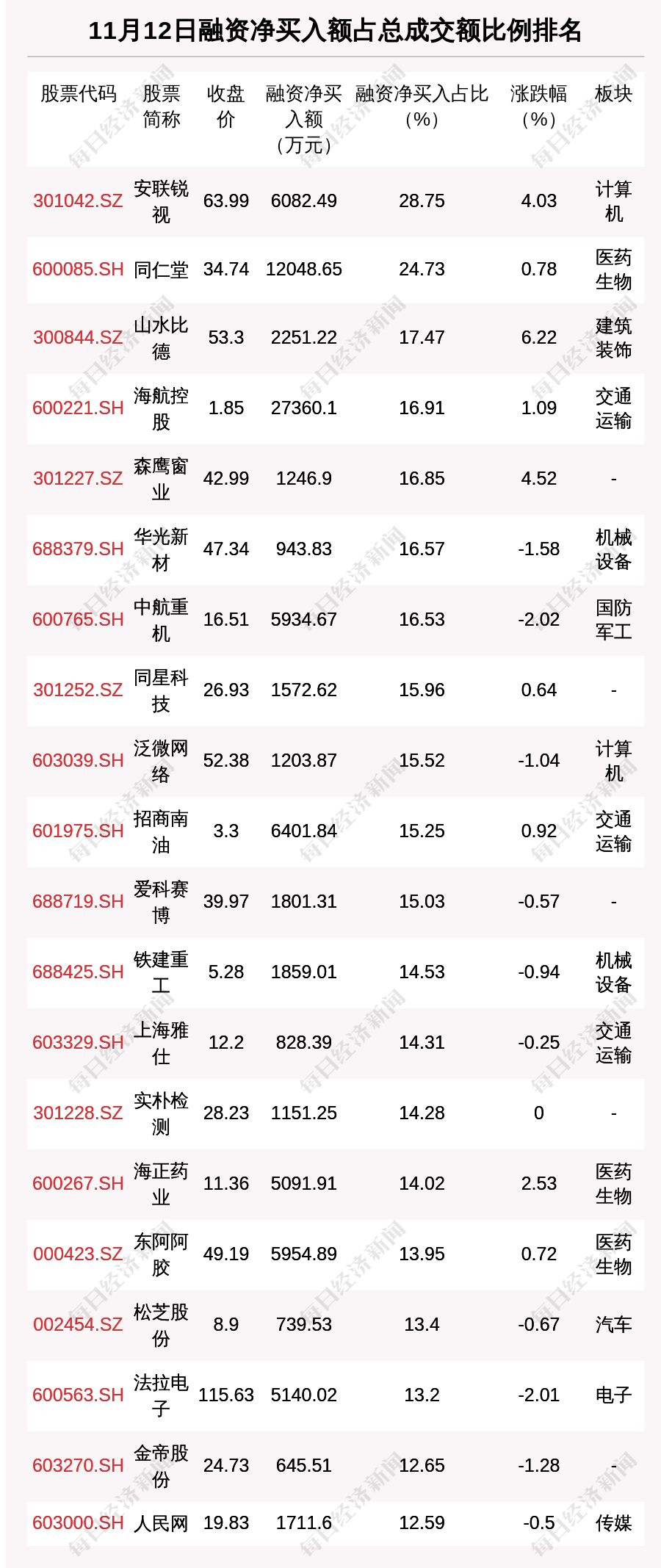 11月12日兩市共有1414只個股有融資資金凈買入。共有39只股票融資凈買入額占總成交金額比例超10%,其中安聯銳視、同仁堂、山水比德排名前三,占比分別為28.75%、24.73%、17.47%。