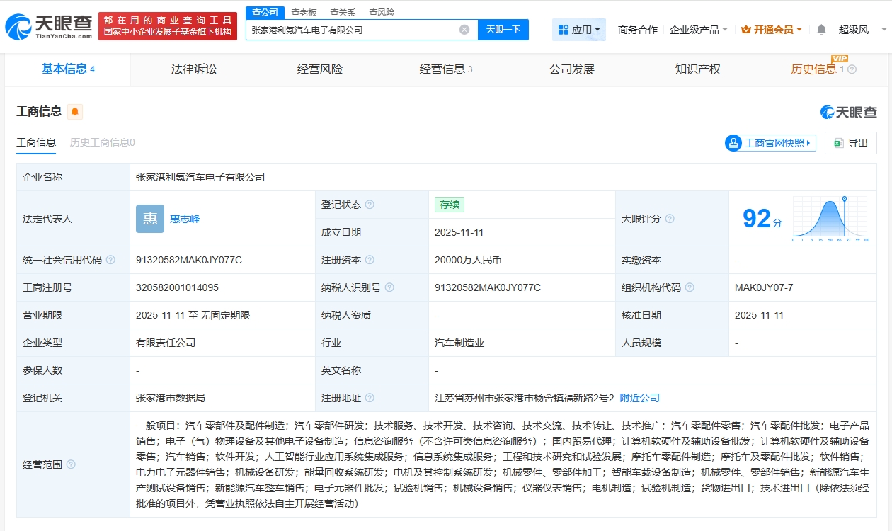 每經AI快訊,天眼查App顯示,近日,張家港利氪汽車電子有限公司成立,法定代表人為惠志峰,注冊資本2億元人民幣,經營范圍包括汽車零部件及配件制造、汽車零部件研發、汽車零配件零售等。股東信息顯示,該公司由利氪(浙江)科技有限公司全資持股。