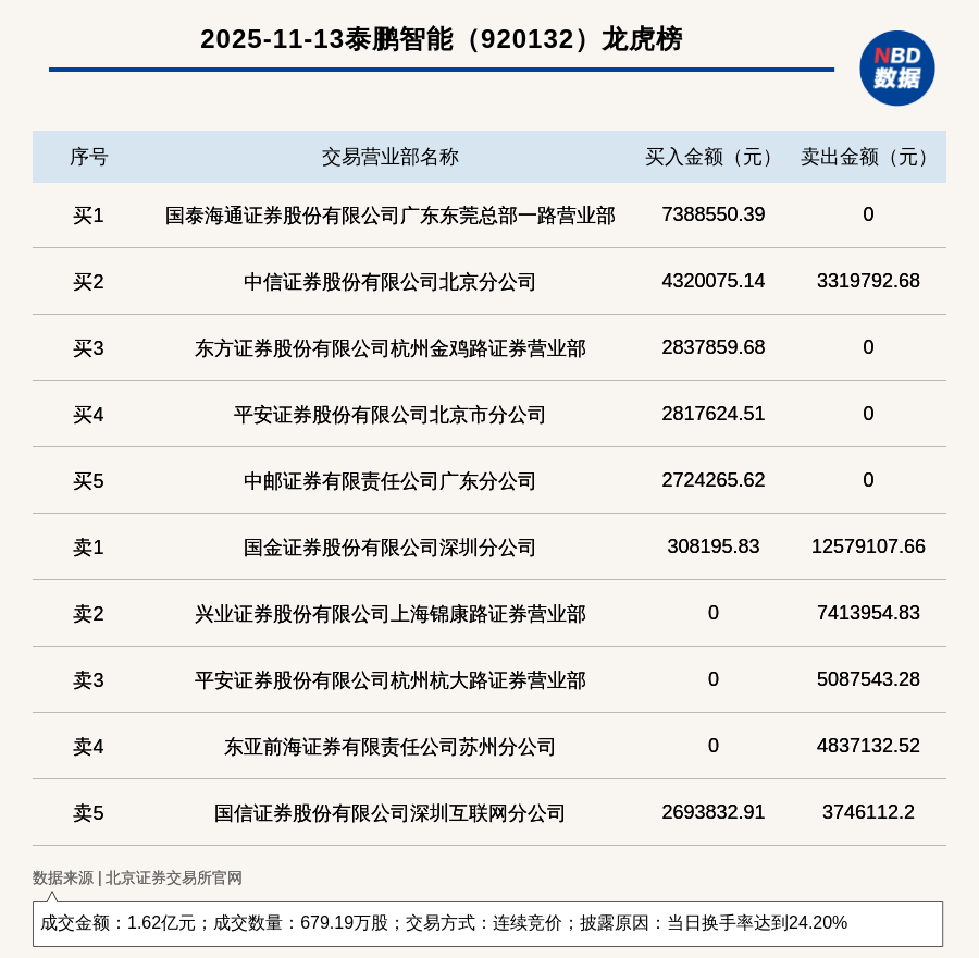 每經訊,2025年11月13日,北交所上市公司泰鵬智能(920132,收盤價:25.01元)登上龍虎榜,交易方式是連續競價,披露原因是當日換手率達到24.20%,成交數量679.19萬股,成交金額1.62億元。買一席位為國泰海通證券股份有限公司廣東東莞總部一路營業部,買入738.86萬元;賣一席位為國金證券股份有限公司深圳分公司,賣出1257.91萬元。
