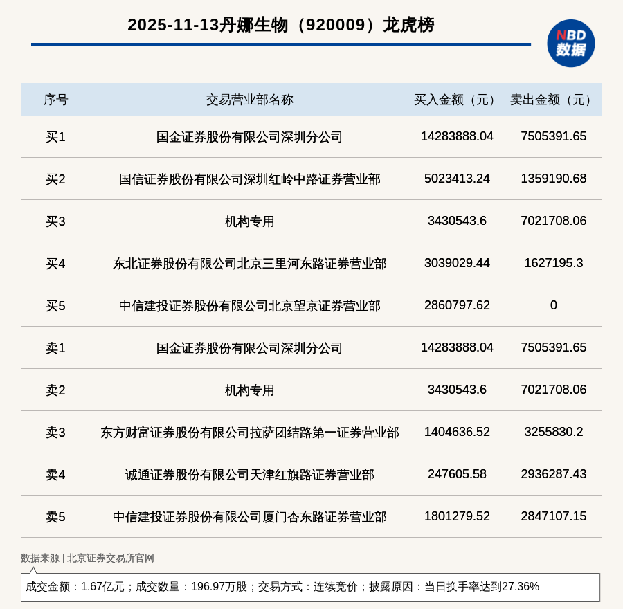 每經訊,2025年11月13日,北交所上市公司丹娜生物(920009,收盤價:84.79元)登上龍虎榜,交易方式是連續競價,披露原因是當日換手率達到27.36%,成交數量196.97萬股,成交金額1.67億元。買一席位為國金證券股份有限公司深圳分公司,買入1428.39萬元;賣一席位為國金證券股份有限公司深圳分公司,賣出750.54萬元。