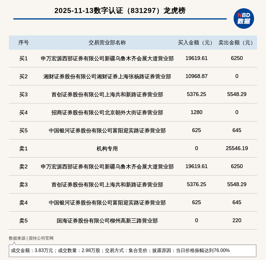 每經訊,2025年11月13日,新三板創新層公司數字認證(831297,收盤價:1.28元)登上龍虎榜,交易方式是集合競價,披露原因是當日價格振幅達到76.00%,成交數量2.98萬股,成交金額3.83萬元。買一席位為申萬宏源西部證券有限公司新疆烏魯木齊會展大道營業部,買入1.96萬元;賣一席位為機構專用,賣出2.55萬元。