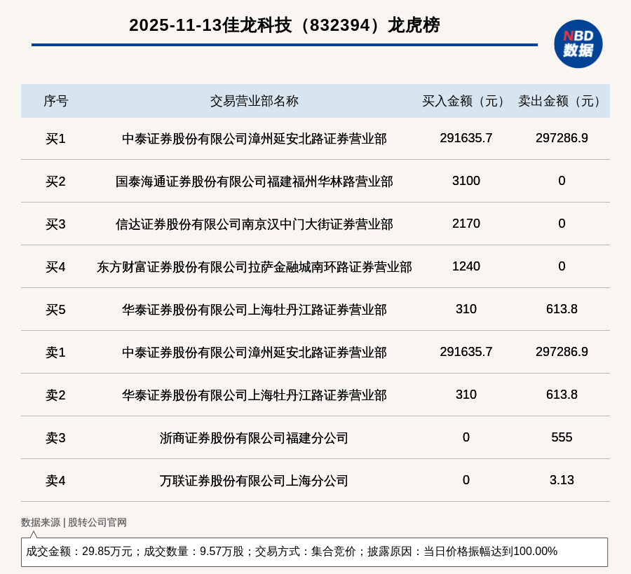每經訊,2025年11月13日,新三板創新層公司佳龍科技(832394,收盤價:5.55元)登上龍虎榜,交易方式是集合競價,披露原因是當日價格振幅達到100.00%,成交數量9.57萬股,成交金額29.85萬元。買一席位為中泰證券股份有限公司漳州延安北路證券營業部,買入29.16萬元;賣一席位為中泰證券股份有限公司漳州延安北路證券營業部,賣出29.73萬元。