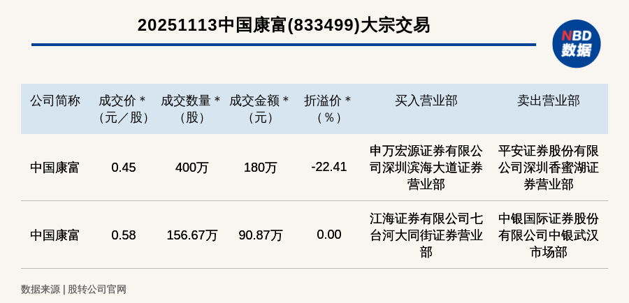 每經訊,2025年11月13日,新三板基礎層公司中國康富(833499,收盤價:0.58元)發生2筆大宗交易,總成交金額為270.87萬元,成交金額最高的一筆成交價0.45元/股,成交數量400萬股,成交金額180萬元,折價22.41%。買入營業部是申萬宏源證券有限公司深圳濱海大道證券營業部,賣出營業部是平安證券股份有限公司深圳香蜜湖證券營業部。