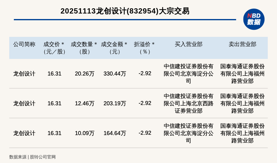 每經訊,2025年11月13日,新三板創新層公司龍創設計(832954,收盤價:16.8元)發生3筆大宗交易,總成交金額為698.27萬元,成交金額最高的一筆成交價16.31元/股,成交數量20.26萬股,成交金額330.44萬元,折價2.92%。買入營業部是中信建投證券股份有限公司北京海淀分公司,賣出營業部是國泰海通證券股份有限公司上海福州路營業部。