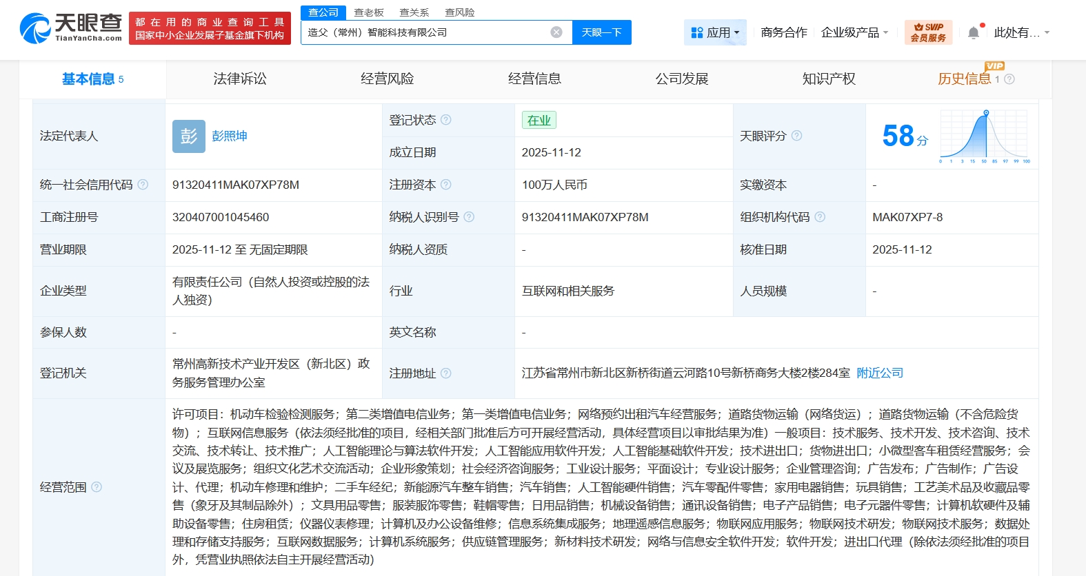每經AI快訊,天眼查工商信息顯示,近日,造父(常州)智能科技有限公司成立,法定代表人為彭照坤,注冊資本100萬元人民幣,經營范圍含機動車檢驗檢測服務、網絡預約出租汽車經營服務、道路貨物運輸、互聯網信息服務、人工智能理論與算法軟件開發、人工智能應用軟件開發、二手車經紀等。股東信息顯示,該公司由造父智能旗下廣州造父智能科技有限公司全資持股。