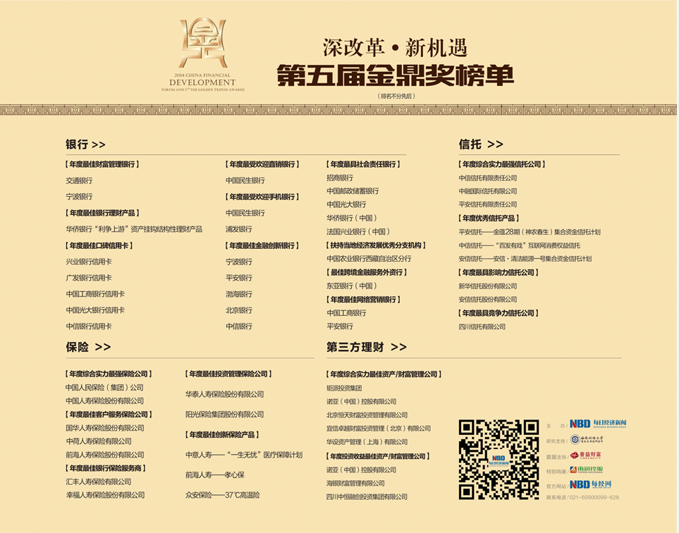 金鼎獎?傳統金融評選活動是專門針對銀行、保險、信托領域而設定,其評選過程嚴謹、科學,通過多個維度考量該領域機構在一年內的各方面表現.