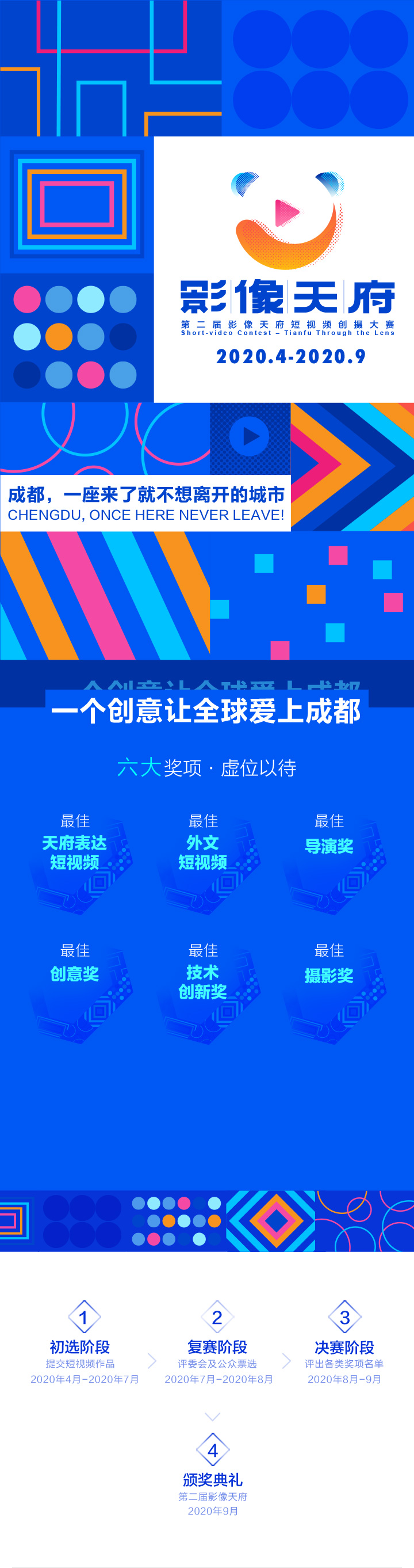 “第二屆影像天府·短視頻創攝大賽”于2020年4月正式啟動,邀約全球創攝愛好者續寫“成都,一座來了就不想離開的城市”篇章,征集優質影像作品。本次大賽設置最佳天府表達短視頻、最佳外文短視頻、最佳導演獎、最佳創意獎、最佳技術創新獎、最佳攝影獎六大專業。評委包括中國電影家協會副主席,上海電影家協會主席任仲倫;艾美獎得主,美國著名影視導演、制片人Mark Zaslove;著名導演、編劇、制片人蔣欽民;洋蔥視頻聯合創始人聶陽德......