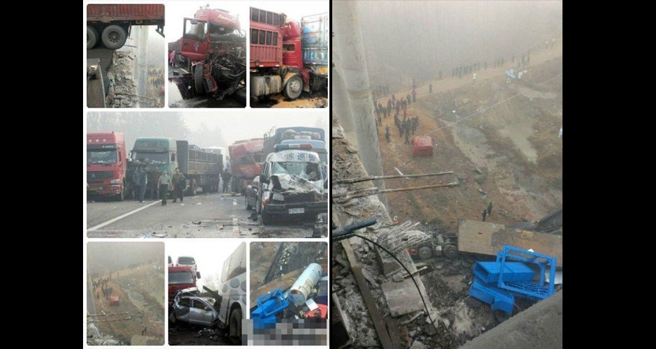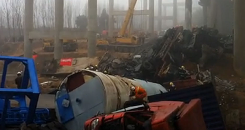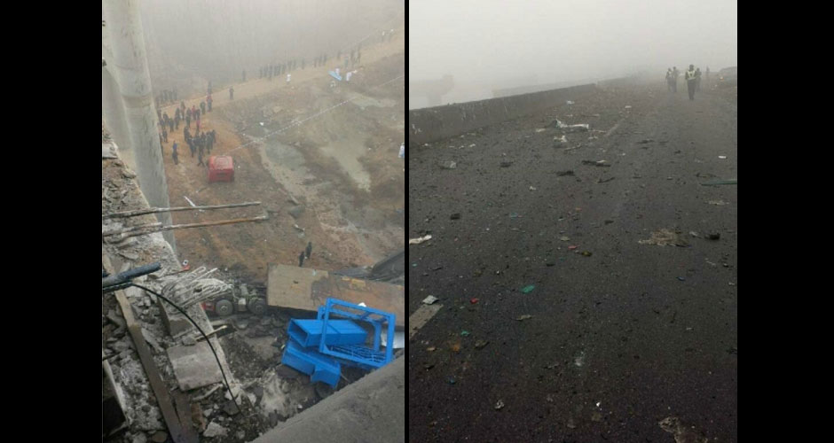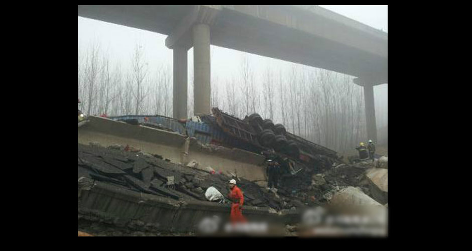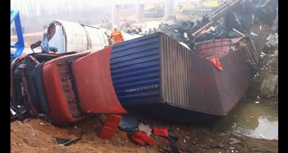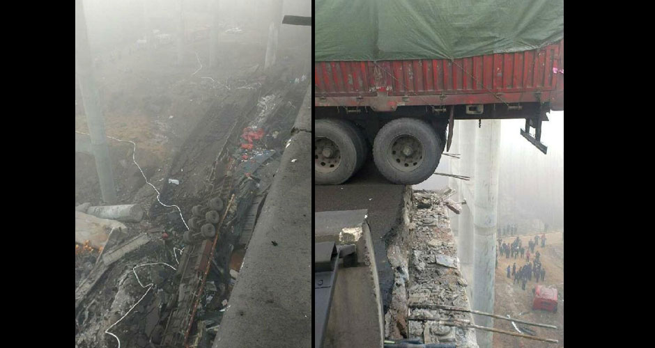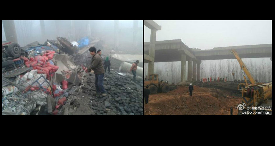 據有媒體現場報道,看到橋面三大一小四臺貨車掉落地面,兩具遇難者遺體停放在事故貨車邊。數名傷者已送醫急救。【查看專題】