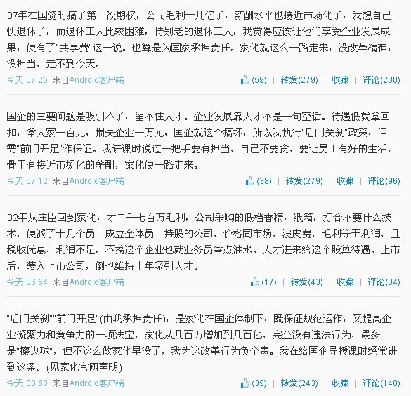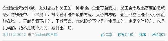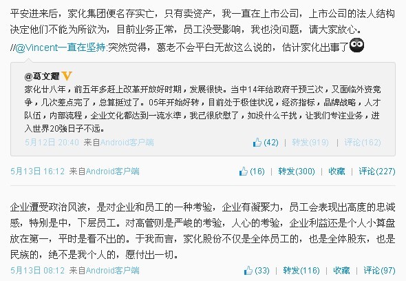 昨(zuo)日下午,葛文耀發(fa)的另一(yi)條微博中,將(jiang)矛(mao)頭直指大股東平(ping)安集團(tuan):“平(ping)安進來后,家化(hua)集團(tuan)便名存(cun)實亡,只(zhi)有賣(mai)資產,我一(yi)直在(zai)上市公(gong)司(si),上市公(gong)司(si)的法人結(jie)構(gou)決定他(ta)們不能為所欲為……”